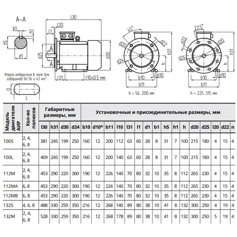 | Питающая сеть | 220/380 В (при габаритах 56–112 мм), 380/660 В (при габаритах 132–315 мм). Частота 50 Гц |