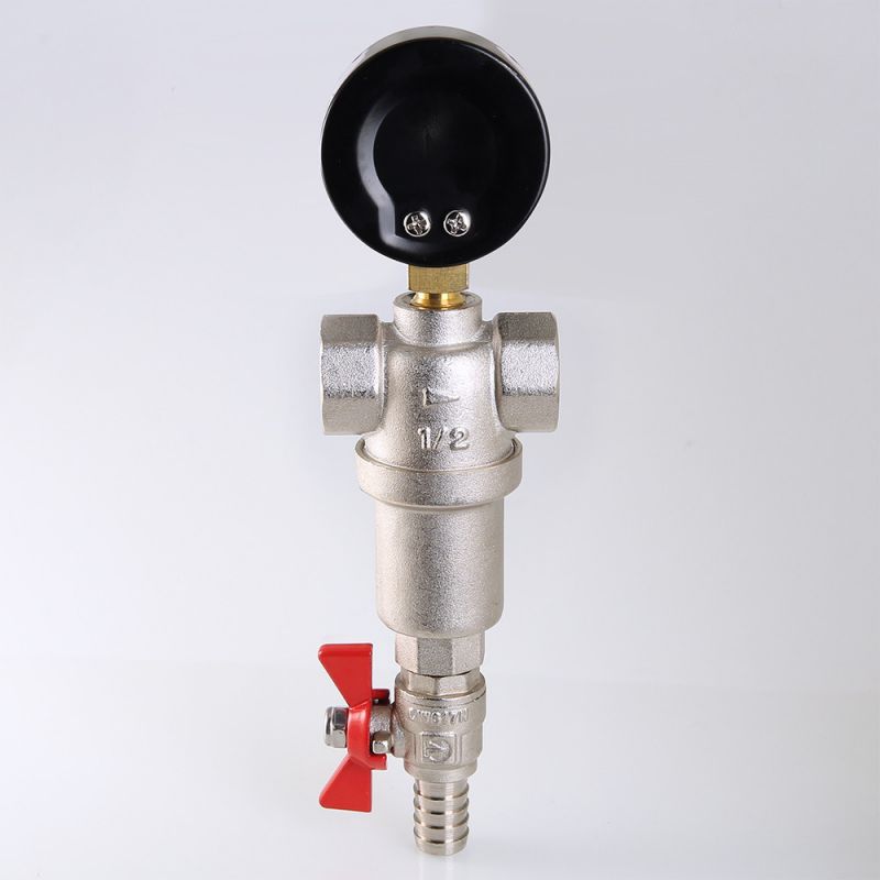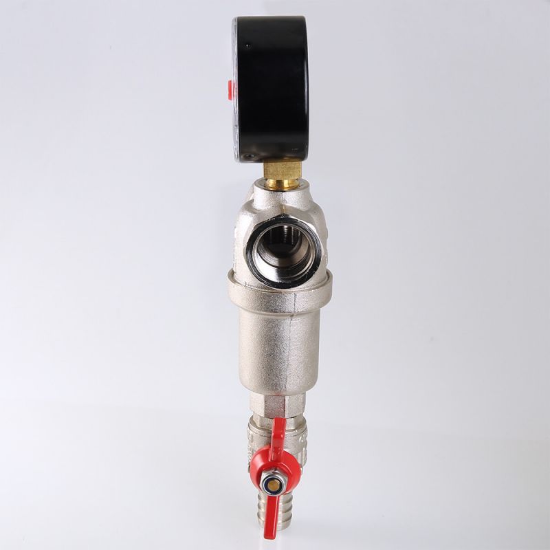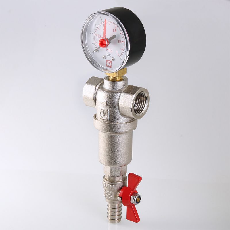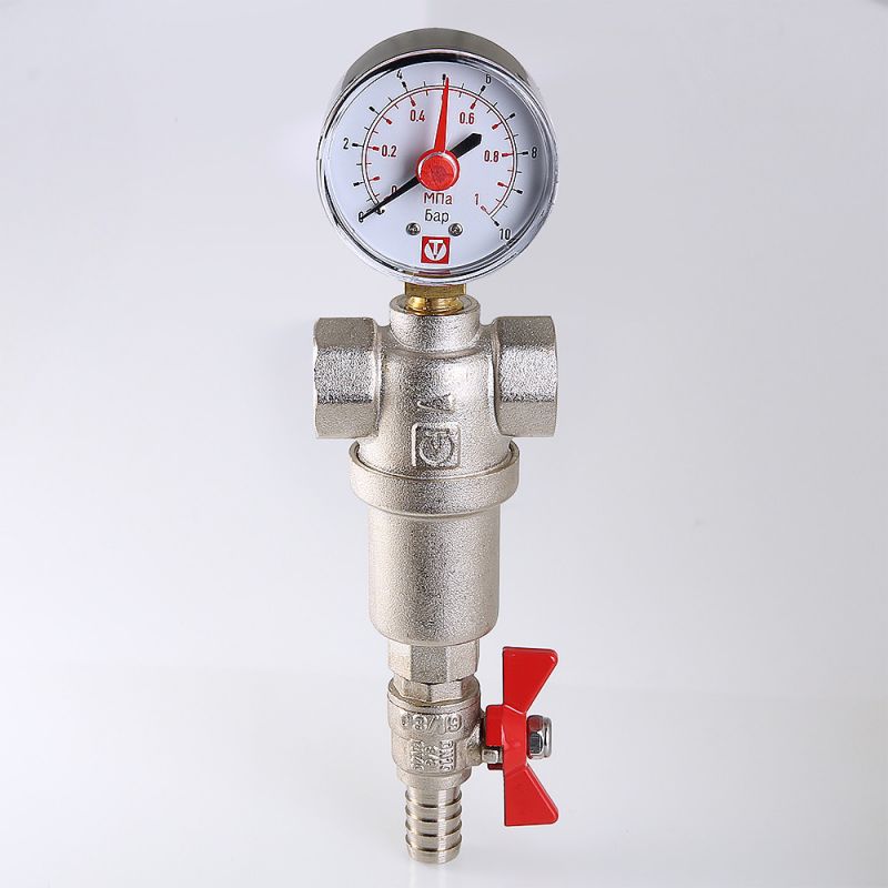 VT.390.N Компактный фильтр механической очистки воды с возможностью удаления накопившихся загрязнений без извлечения сетчатых вставок (промывной фильтр). Оснащен двумя (один в другом) фильтроэлементами из нержавеющей стали. Размер ячеек сетки первичного фильтроэлемента – 500, вторичного – 100 мкм. Корпус и колба фильтра выполнены из латуни марки CW617N (европейский стандарт EN 12165), никелированы. Предусмотрены дренажный шаровой кран со штуцером для подключения шланга и манометр для контроля уровня загрязненности сеток. Фильтр монтируется в вертикальном положении, колбой вниз. Резьба присоединений – внутренняя.