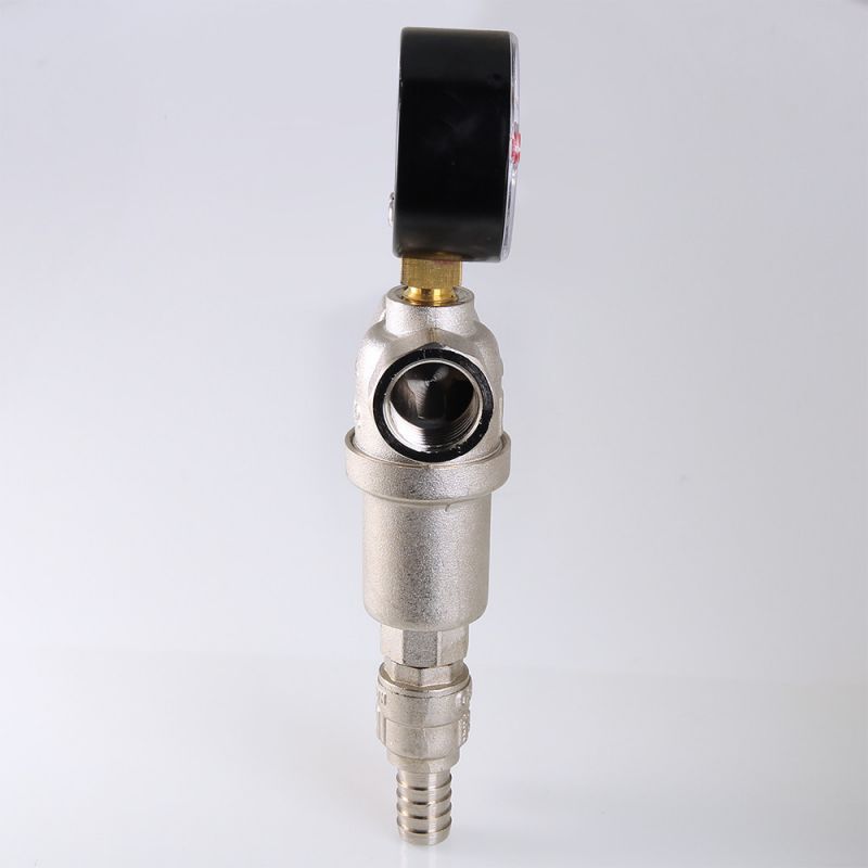 VT.390.N Компактный фильтр механической очистки воды с возможностью удаления накопившихся загрязнений без извлечения сетчатых вставок (промывной фильтр). Оснащен двумя (один в другом) фильтроэлементами из нержавеющей стали. Размер ячеек сетки первичного фильтроэлемента – 500, вторичного – 100 мкм. Корпус и колба фильтра выполнены из латуни марки CW617N (европейский стандарт EN 12165), никелированы. Предусмотрены дренажный шаровой кран со штуцером для подключения шланга и манометр для контроля уровня загрязненности сеток. Фильтр монтируется в вертикальном положении, колбой вниз. Резьба присоединений – внутренняя.