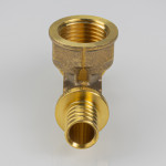 VTm.432.G – трехсторонний латунный аксиальный фитинг с переходом на внутреннюю резьбу в центральном отводе, обеспечивающем присоединение к полимерному трубопроводу элемента системы с резьбовым патрубком.