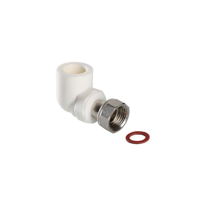 Двухсторонний полипропиленовый фитинг для соединения под углом 90° друг к другу полипропиленового трубопровода и компонента инженерной системы с резьбовым подключением. Монтаж осуществляется с помощью накидной гайки.