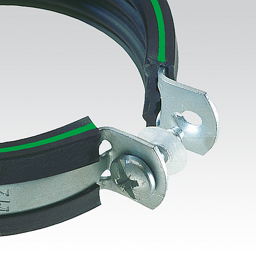 - Виброизоляционная резина не выскальзывает из хомута благодаря геометрическому замыканию и широкому охвату кромок