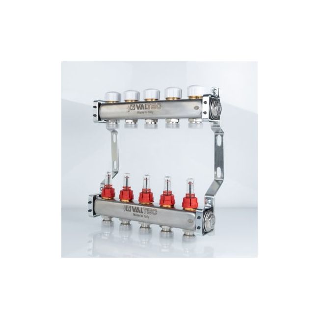 Коллектор VTc.584.EMNX — профессиональный коллекторный блок из нержавеющей стали AISI 304 для систем водяного тёплого пола. Предназначен для равномерного распределения теплоносителя по контурам напольного отопления с возможностью точной ручной настройки расхода.