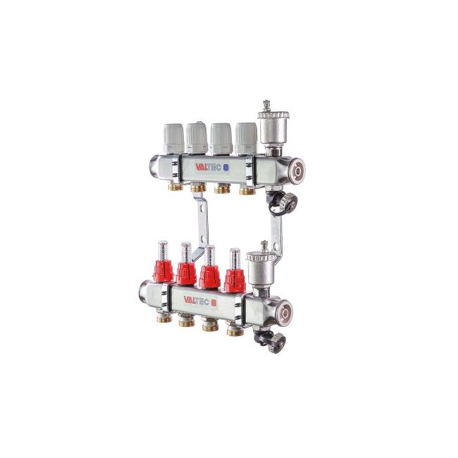 Коллекторные блоки Valtec для распределения теплоносителя по петлям теплого пола или по приборам отопления. Выходы подающего коллектора укомплектованы ручными регулировочными клапанами с расходомерами, обратного – ручными запорными клапанами, на которые можно установить электротермические сервоприводы. Каждый коллектор имеет автоматический воздухоотводчик и дренажный клапан.