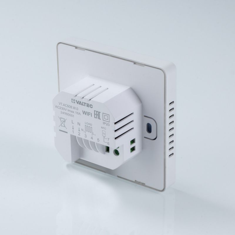 (VT.AC608.W) Комнатный WIFI-хронотермостат предназначен для подачи управляющего сигнала (включить/выключить) на электрический теплый пол и исполнительные устройства водяного теплого пола или радиаторного отопления. Управление осуществляется в зависимости от температуры воздуха в помещении (встроенный датчик) и температуры пола (выносной датчик). Возможны недельное программирование и выбор режима работы – по датчику температуры воздуха или датчику температуры пола, а также совместный режим с двумя датчиками, при котором управление происходит по температуре воздуха, а выносной датчик служит как ограничитель от перегрева поверхности.