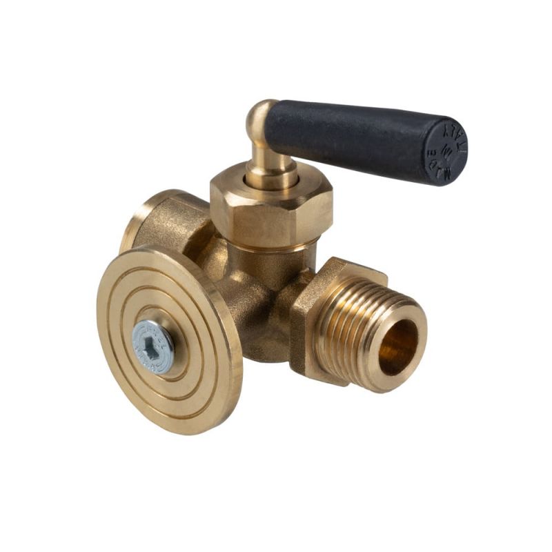 Кран латунный пробковый трехходовой предназначен для присоединения манометра к трубопроводам, транспортирующим жидкости и газы с температурой до 80 °С под давлением до 16 бар. Корпус крана изготовлен методом горячего прессования из латуни марки CW 617N, без гальванопокрытия, и имеет фланец для подключения контрольного манометра. В зависимости от положения запорной пробки с Т-образным проходом, подсоединенный к крану прибор сообщается с рабочей средой или атмосферой. При повороте ручки на 180° среда поступает как рабочий, так и в контрольный манометр. На кран можно устанавливать измерительные приборы с трубной цилиндрической резьбой. Ресурс крана – 5 тыс. циклов. Производитель изделия – компания Officine Rigamonti (Италия).