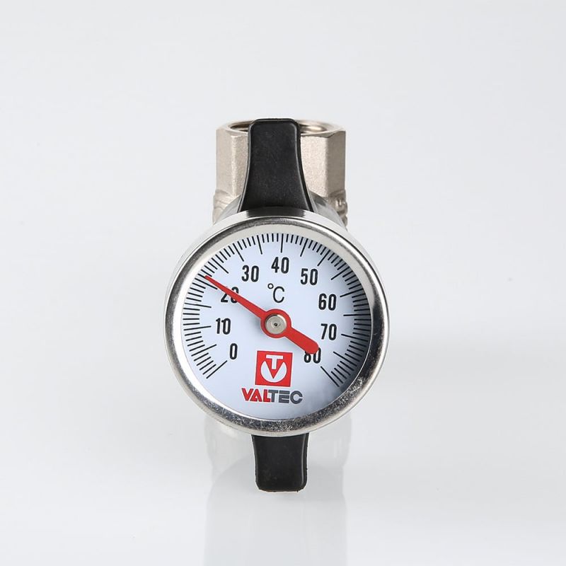 Термометр, встроенный в рукоятку управления шарового крана VALTEC BASE VT.808, обеспечивает визуальный контроль температуры рабочей среды в тепловых пунктах, узлах ввода горячей воды, трубопроводах обвязки бойлера и других точках инженерных систем. Термометр соединен с шаровым затвором гильзой из медного сплава, что позволяет измерять температуру с минимальной погрешностью. При необходимости прибор легко извлекается из рукоятки, а его гнездо закрывается заглушкой из ABS-пластика. Из этого же материала выполнена и сама рукоятка крана. Диаметр шкалы термометра – 42 мм,