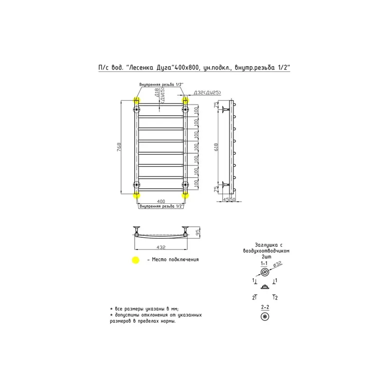 Полотенцесушитель водяной "Лесенка Дуга" Олимп 500x600, подключение 1/2", Размер полотенцесушителя ВхШ, мм: 500*800, Тип подключения: Водяной, Форма полотенцесушителя: Лесенка, Резьба подключения: G1/2",внутренняя