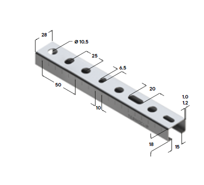 Профиль монтажный – шина, С - образной формы c монтажными отверстиями предназначен для быстрого горизонтального и вертикального монтажа легких инженерных систем, систем вентиляции и кондиционирования, электроснабжения, трубопроводов, а также для изготовления стенных консолей, стеллажей и рам различного типа. Рекомендуется для применения в сухих и влажных помещениях.