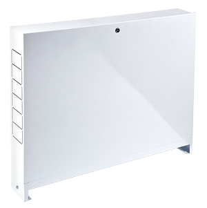 Пристраиваемые коллекторные шкафы (распределительные шкафы) VALTEC VTc.541.D предназначены для размещения в них коллекторов и коллекторных блоков систем внутреннего водопровода и отопления, а также смесительных узлов для водяного теплого пола VT.COMBI и VT.DUAL. Установка шкафа – пристенная. Детали шкафов коллекторных VALTEC выполнены из оцинкованной стали. Лицевые поверхности окрашены порошковой эмалью цвета RAL 9016 с предварительной фосфатной подготовкой поверхности. В боковых стенках корпуса выполнена перфорация, сегменты которой удаляются в месте, удобном для пропуска присоединяемых трубопроводов. Выдвижные ножки дают возможность регулировать высоту шкафа от 661 до 691 мм. Ножки имеют отверстия для крепления шкафа к полу. Откидная дверца имеет замок, защищающий установленное в шкафу оборудование от несанкционированного доступа. Внутри шкафа установлены передвижные монтажные рейки, к которым крепится оборудование. Глубина шкафов VTc.541.D – 135 мм. Ширина предлагаемых моделей: ШРНГ 3 – 704, ШРНГ 4 – 854, ШРНГ 5 – 1004, ШРНГ 6 – 1154, ШРНГ 7 – 1304 мм.