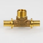 VTm.433.G – трехсторонний латунный аксиальный фитинг с переходом на наружную резьбу в центральном отводе (тройник надвижной с переходом на наружную резьбу), обеспечивающий присоединение к полимерному трубопроводу элемента системы с резьбовым патрубком.