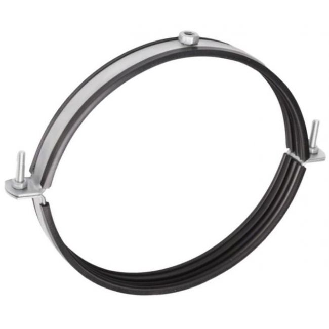 Вентиляционный металлический хомут с резиновым профилем и гайкой, для крепления труб и круглых воздуховодов вентиляционных систем. Изготовлен из стали ГОСТ 16523-97, ГОСТ 19904-90.