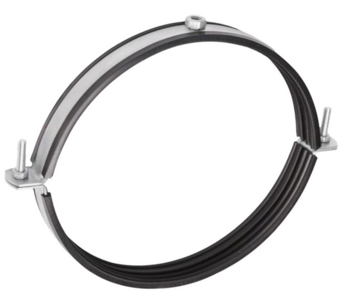 Вентиляционный металлический хомут с резиновым профилем и гайкой, для крепления труб и круглых воздуховодов вентиляционных систем. Изготовлен из стали ГОСТ 16523-97, ГОСТ 19904-90.