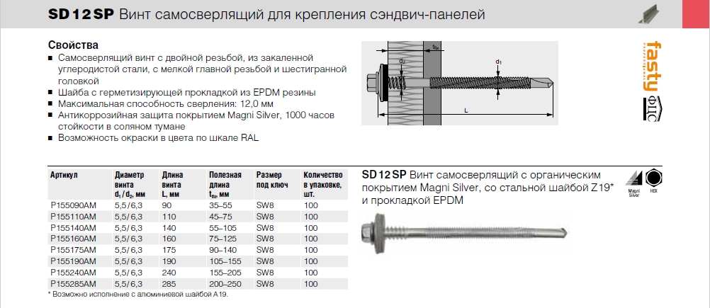 • Винт SD 12 SP самосверлящий для крепления сэндвич-панелей Fasty характеристики